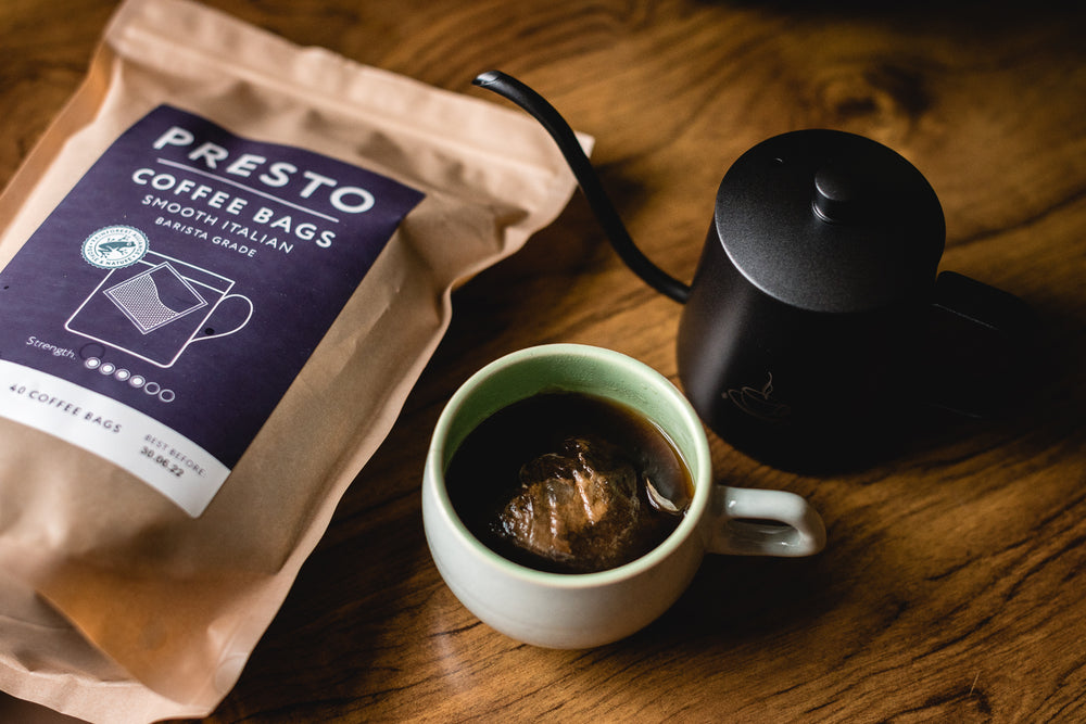While the ground coffee bag might look like a teabag, for a thrilling experience Harrogates have shared with their customers the trick which for less than 5 minutes you can have the blend made perfectly in your cup for that first sip. If it's the Taylors of Harrogate Rich Italian coffee bags that get you going just add a coffee bag to the mug, add boiled water, stir, squeeze, brew for 2mins, squeeze and remove the bag. Your ready for that sip.
