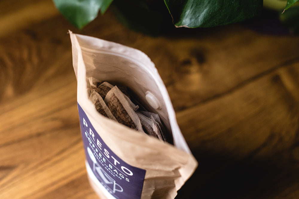 We've sealed 8g of a Rainforest Alliance certified, delicious dark roast inside each bag, which has been specifically designed for optimum brewing in a coffee bag. Simply add hot water! To buy Prestos coffee bags, click here.