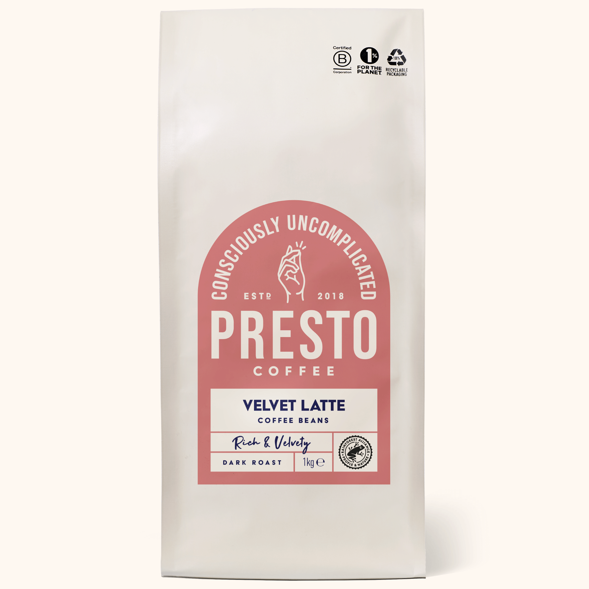 Meet Presto's Velvet Latte Whole Bean Coffee. Savour our toasted cashew & dark cocoa flavour, barista-grade, smooth and silky coffee. This delicious medium roast blend of arabica and robusta beans cuts through the milkiest of lattes.