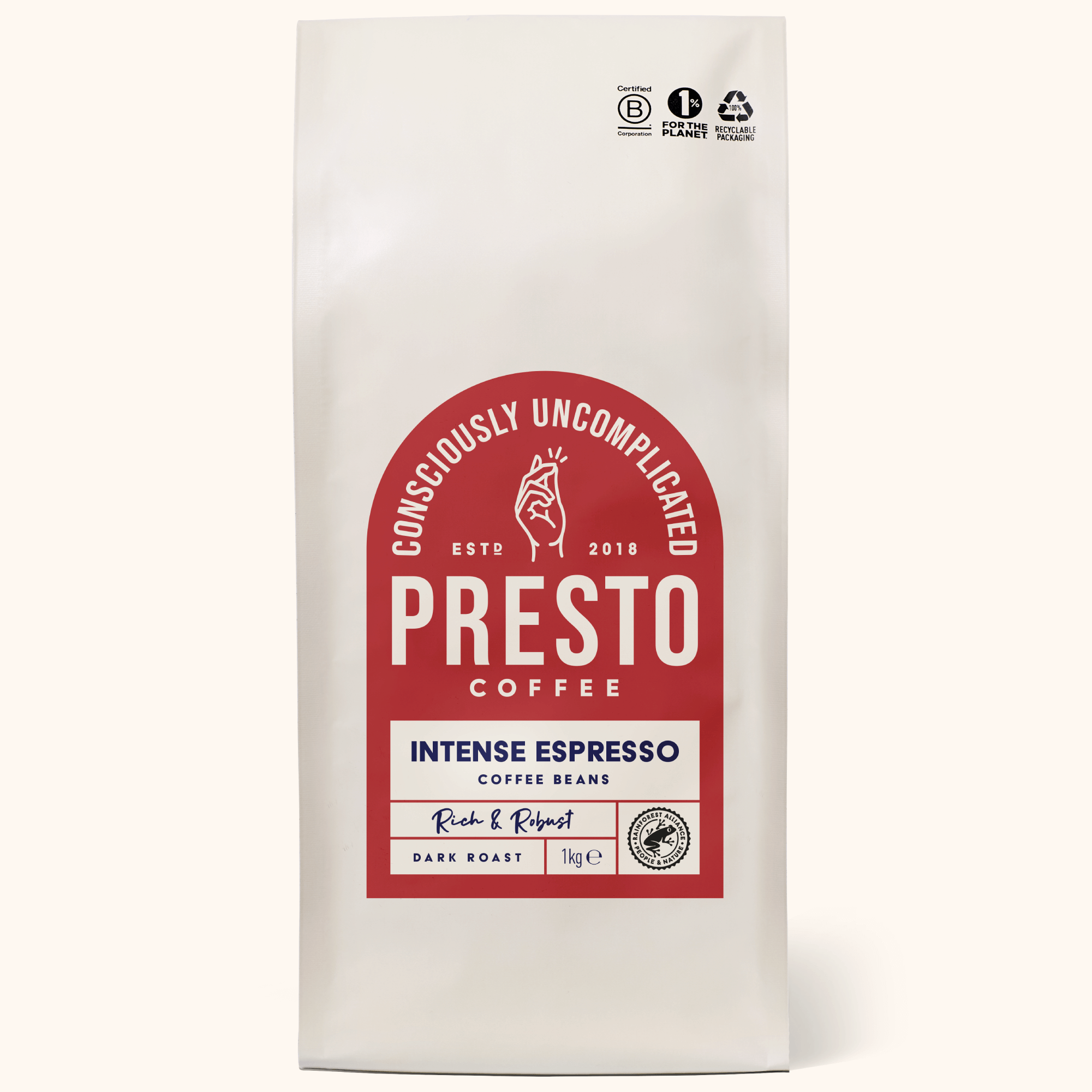 Meet Presto's Intense Espresso Whole Bean Coffee. Enjoy our strongest coffee, tasting of treacle and dark chocolate. It is carefully air-roasted using rich dark single-origin beans from Vietnam. It packs a huge caffeine punch and fuels you throughout your busy day!