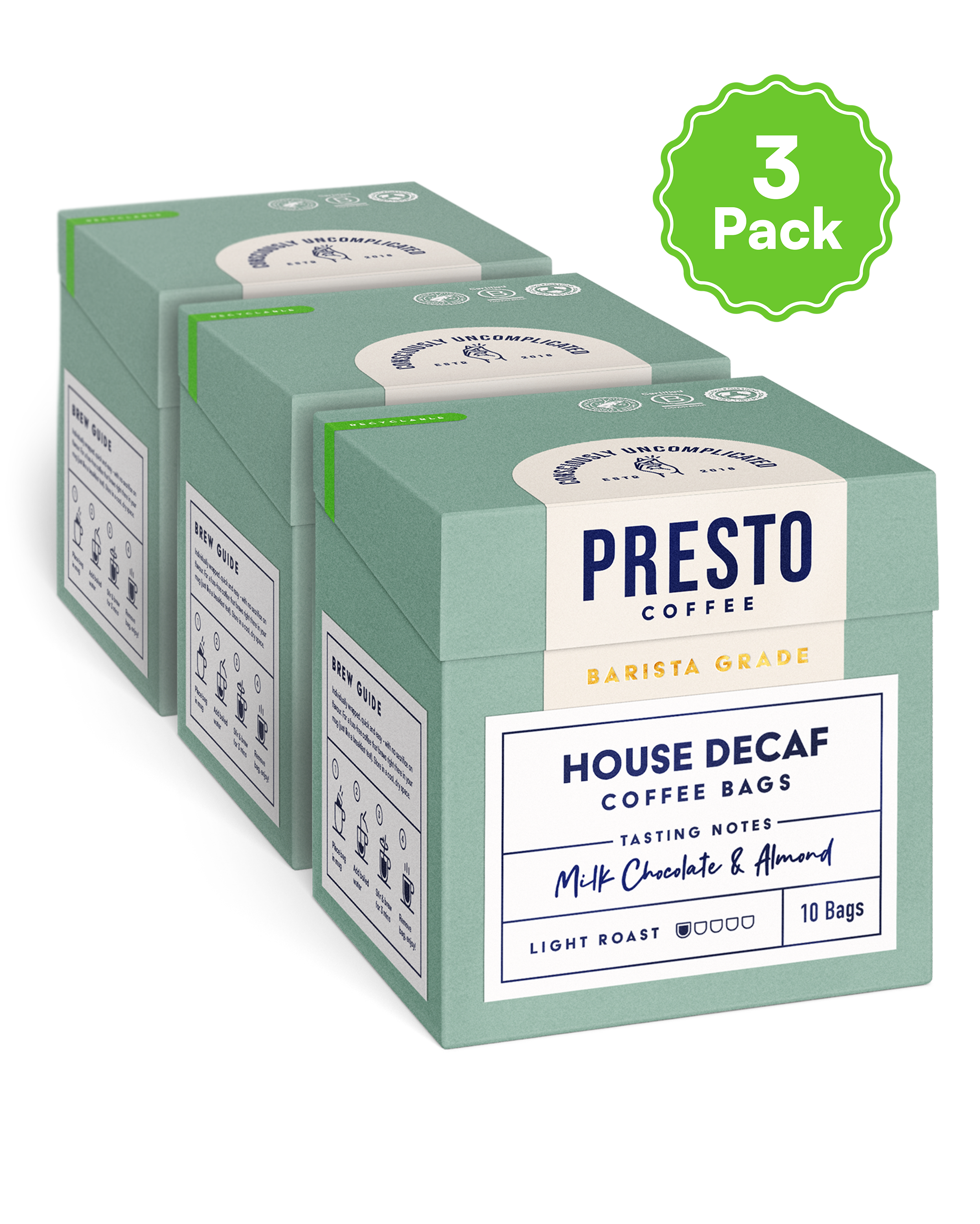 Our House Decaf is a refreshingly light coffee made using single-origin, Rainforest Alliance Certified, Arabica beans sourced from Mexico. All Presto Coffee is B Corp certified, 100% recyclable and we only source our beans from Rainforest Alliance certified farms.